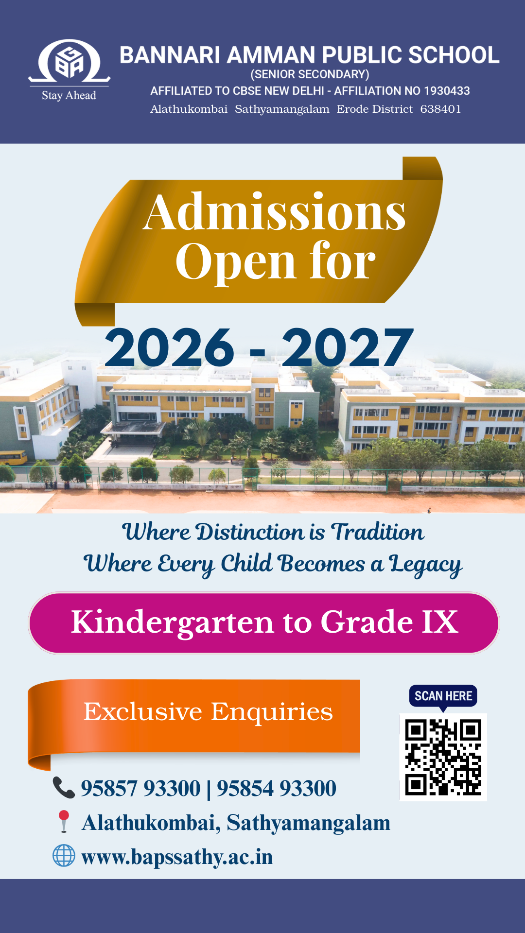 BAPS is a CBSE affiliated school, established by SVB foundation in 2012 at Alathukombai, Erode District of Tamilnadu owing to the deep desire and urge of the people of the locality. Our vision is of a high achieving multi institution educational context in which all young ones achieve their potential through high quality personalized learning that is designed to meet their individual needs.
